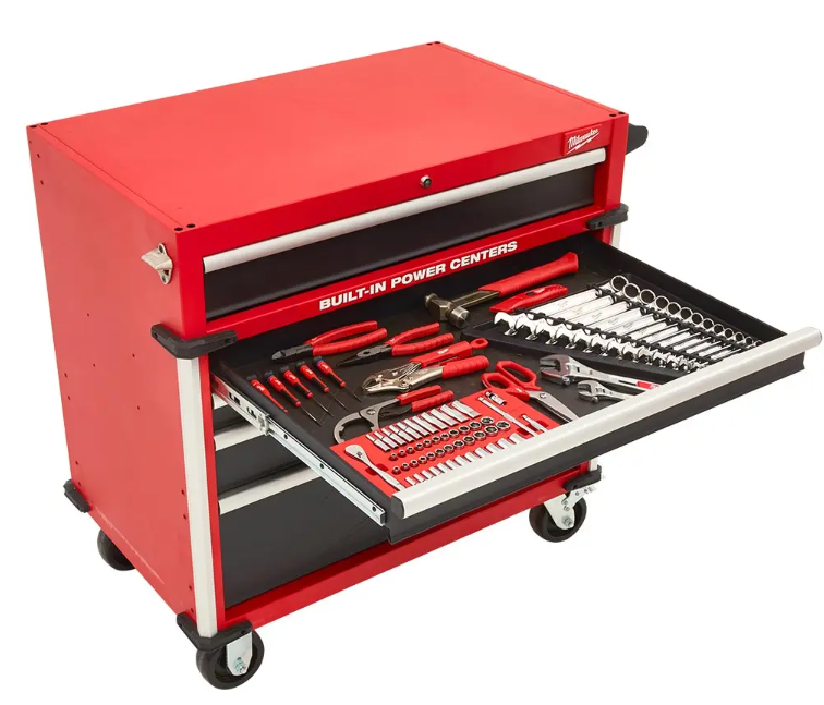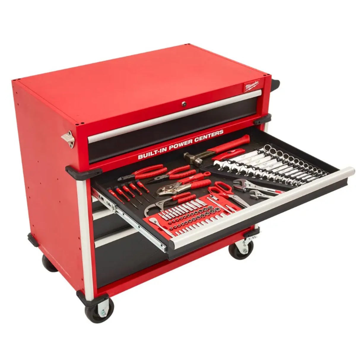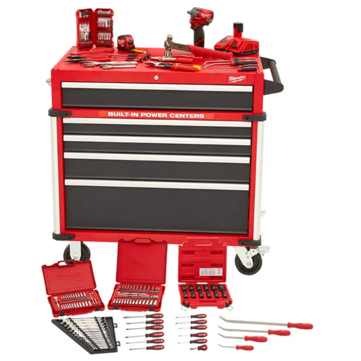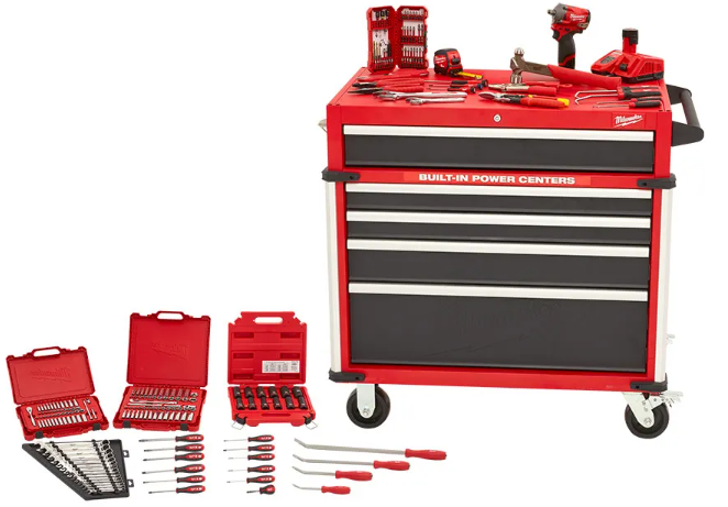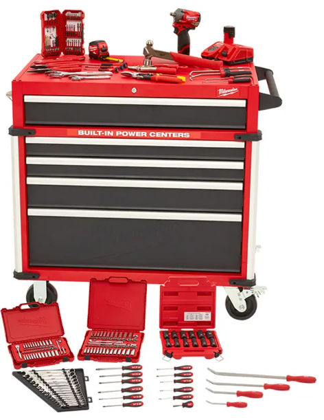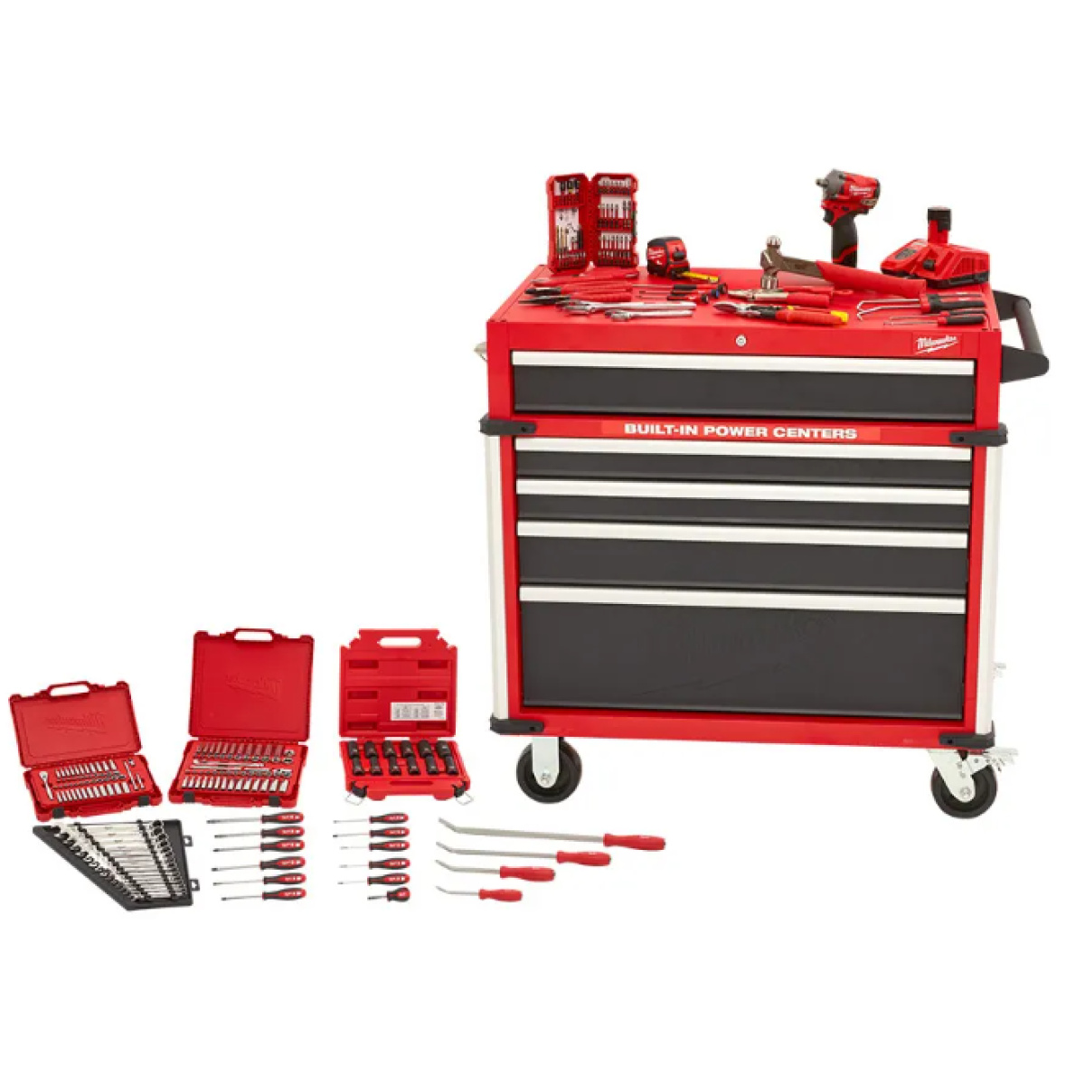 The Milwaukee® 238 Piece Automotive Starter Toolkit is a must-have kit for anyone starting out in the workshop. Your tools will be kept safe and secure in the 36″ Steel Top Mobile Work Bench with its reinforced angle iron frame and 6” industrial casters, while its lockable 45kg soft close drawers, built-in power center, cable hooks and dedicated organiser provide you with the smooth accessibility and modern features required for everyday use. Increase jobsite productivity with our 12V Stubby Impact Wrench, which comes with two battery packs and a charger. The Milwaukee® 238 Piece 36″ Automotive Starter Toolkit also comes with a large range of our innovative Impact rated Accessories and automotive Hand Tools, including ratchet and socket sets, wrench sets, screwdrivers, pliers, pry bars, hook and pick sets and more, so you are ready to tackle any challenge that comes your way.